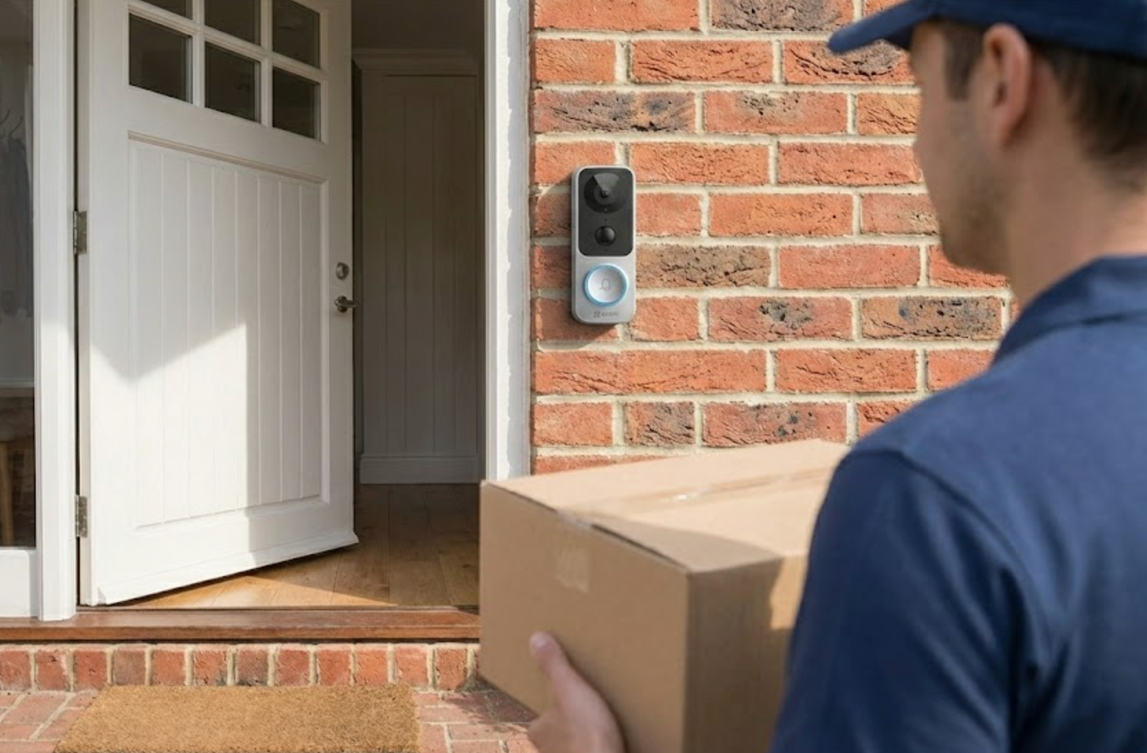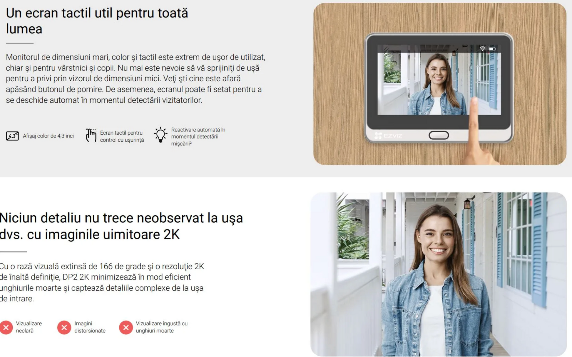 Vizor video smart cu sonerie EZVIZ DP2 2K este un vizor video modern pentru usa de la intrare care combina soneria traditionala cu o camera video de inalta rezolutie si un monitor interior tactil. Produsul ofera acces instant si confortabil la imaginea si comunicarea cu vizitatorii, fie direct pe monitor, fie prin aplicatia mobila.