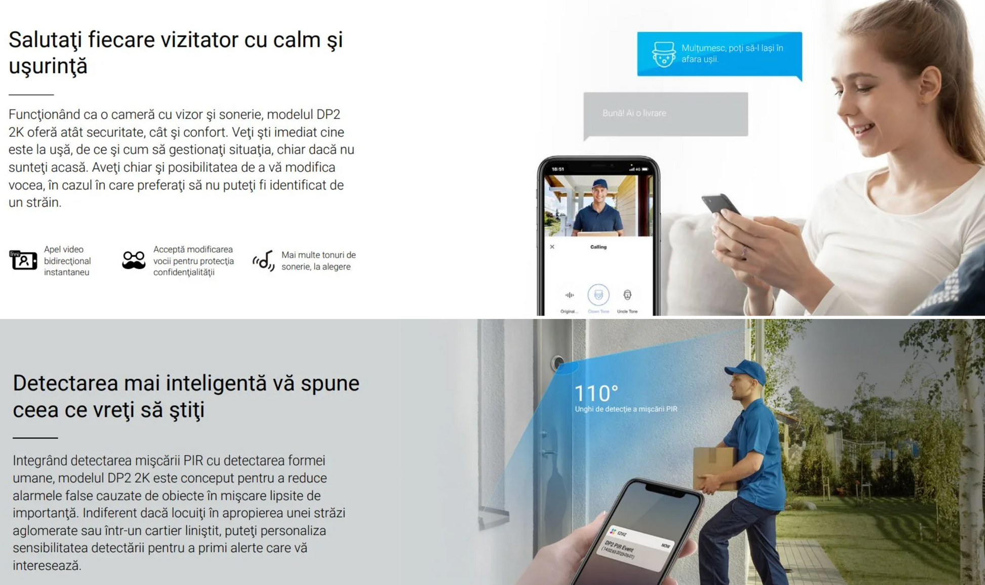 Poti vorbi cu vizitatorii prin audio bidirectional sau poti raspunde de pe telefon prin aplicatie daca nu esti acasa.